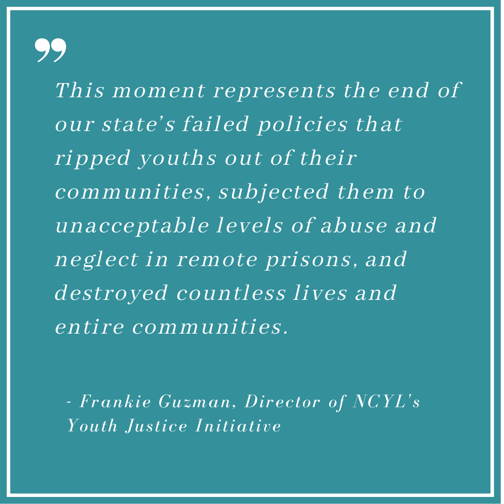 NCYL and coalition of advocates worked with lawmakers to create a plan that emphasizes local innovation and collaboration to improve youth outcomes and public safety, and creates a state Office of Youth and Community Restoration to encourage evidence-based, health-centered approaches to treating youth that have come into conflict with the law. Now more than ever, youth need community and care, not cops and cages. We look forward to helping with effective implementation of the new plan and ensuring all youth are treated in a manner appropriate for their age, cognitive development, and ability to change.