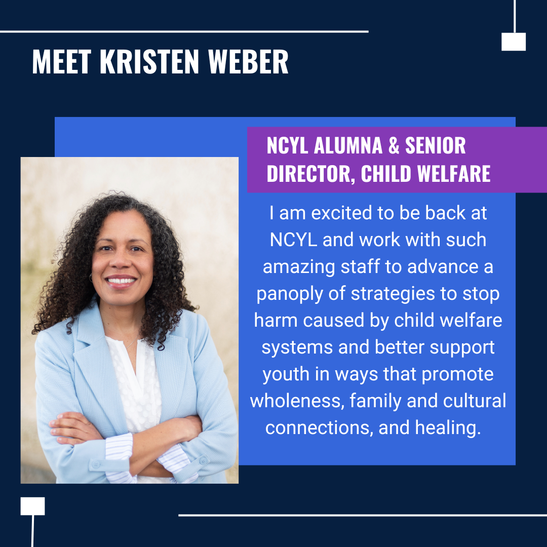 NCYL is uniquely poised to use a mixture of strategies — from legal advocacy and litigation to policy and communications — to be a leader in the larger national change that is afoot to better support kids and families and end racist and harmful interventions. I am excited to be back at NCYL and work with such amazing staff to advance a panoply of strategies to stop harm caused by child welfare systems and better support youth in ways that promote wholeness, family and cultural connections, and healing.